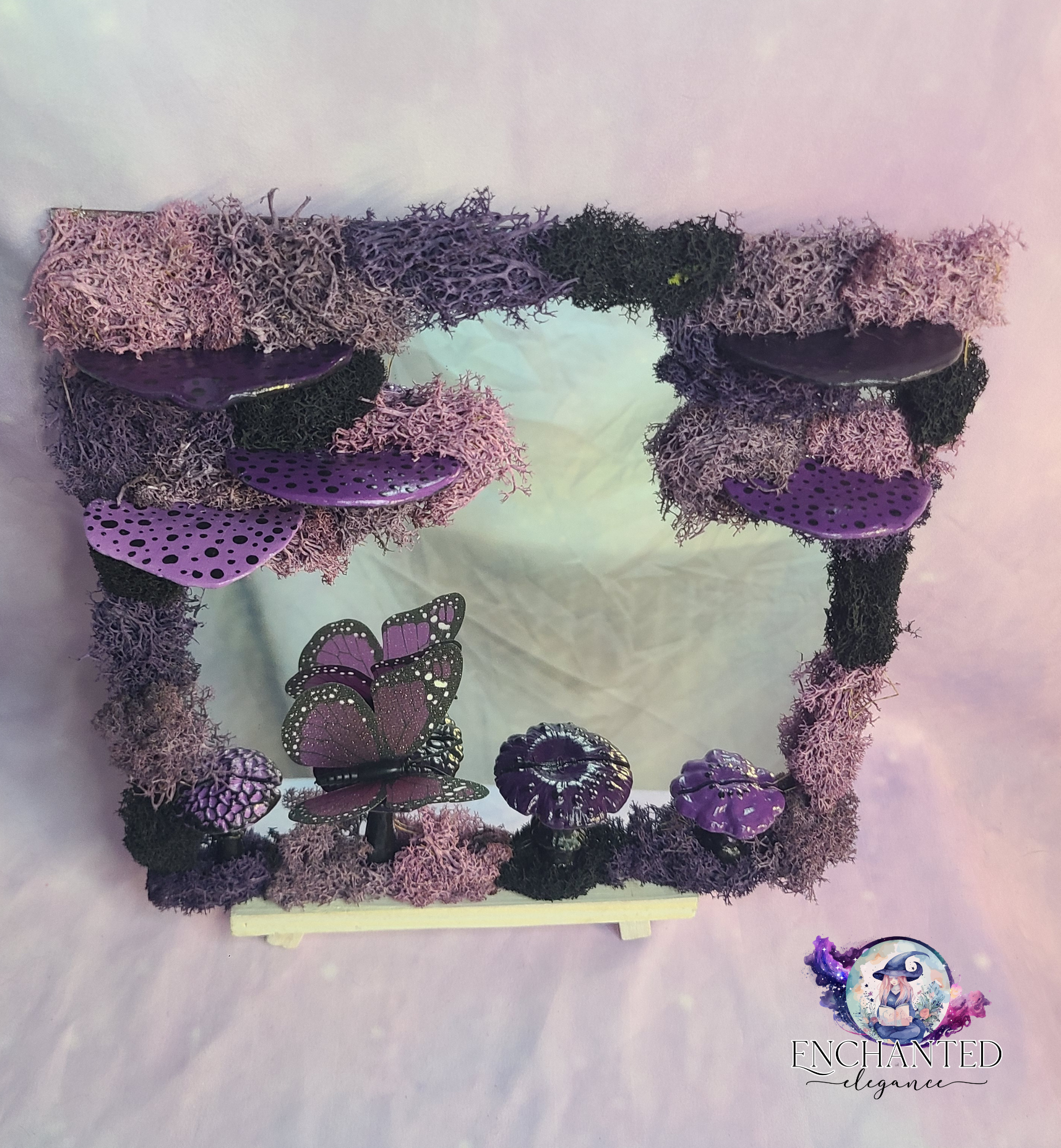 Step into a fairy tale, but make it dark and sassy. This 10x10 moss mirror is dripping in mystical vibes, with rich purple and black moss, delicate mushrooms, and a butterfly that looks like it just fluttered in from an enchanted forest. Perfect for witches, woodland fae, and anyone who believes a little magic belongs in their home.