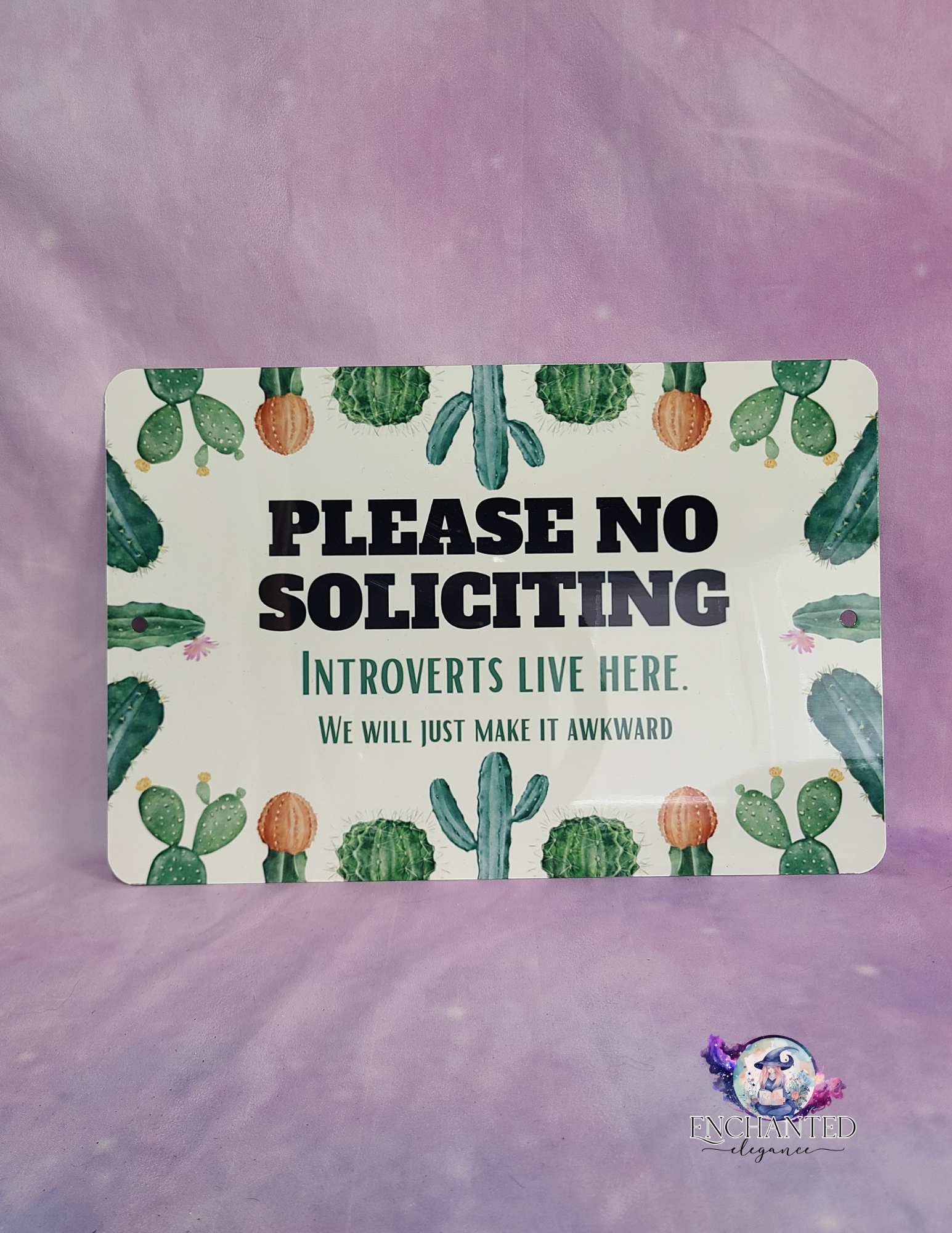 No Soliciting — unless you’re bringing tacos or minding your business. Introverts live here, and trust us, we’ll make it awkward AF if you knock. This sassy cactus-themed sign is 8x12 inches of metal magic, complete with two holes for easy mounting. Cute, durable, and guaranteed to help you avoid unwanted conversations!